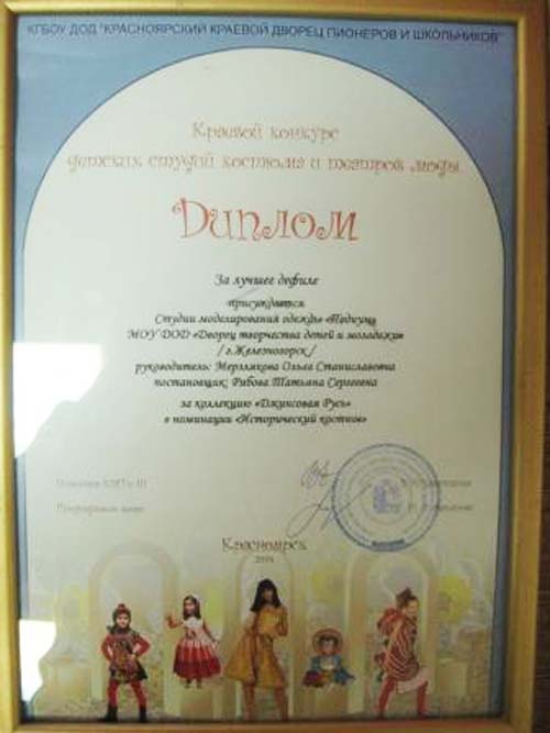 Студия моделирования одежды Дворца творчества представляла коллекцию "Джинсовая Русь" в номинации "Исторический костюм", награждена дипломом и ценным призом за лучшее дефиле. Церемония награждения перешла в обсуждение с членами жюри представленных программ и выступлений. ![]() | |